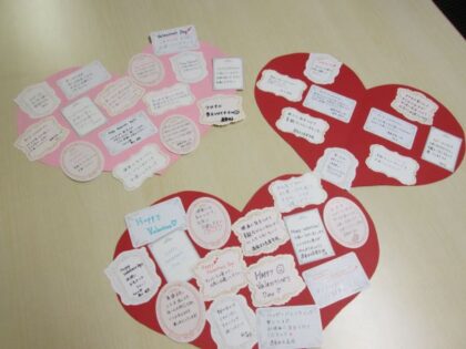バレンタインデーのハートの台紙の中に入居者様への暖かいメッセージ!