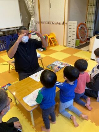 いつもの英語でリトミックをした後、色の見本を見ながら“RED”、”BLUE”、“YELLOW”など教えてもらい、