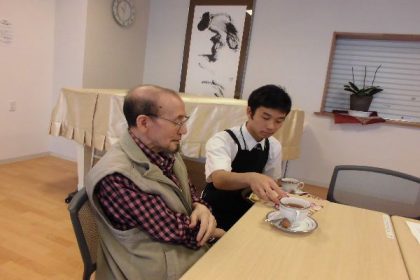 8月28日(火) ハウスを卒業される利用者さんの利用最終日という事で、お別れ会を行ないました。集合写真を撮った後は、おまんじゅうを食べ、プレゼントしたメッセージ入りアルバムの写真を見ながら皆で色々お話されていました。スタッフより歌、踊りのプレゼンツあり。皆さんつられて歌っておられました。ご本人からも急な1曲(星影のワルツ)のお礼がありました。
