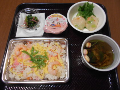 ※メニュー=ちらし寿司、澄まし汁、ふんわり枝豆しんじょう、葉の花辛子和え、ひな祭り桃ゼリー