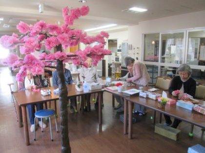 7日のお花見の会に向けて、各フロアでは入居者様にも協力して頂き桜の花作りを開始!