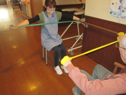 日々のフロア体操、口腔体操の他に3ヶ月に1度、体力測定を行い、機能訓練指導員による機能訓練も個別に行っています!