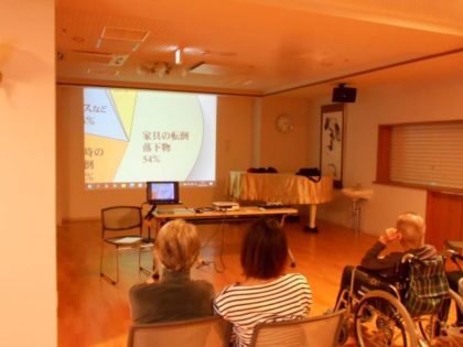 1階コミュニティホールにて入居者様と一緒に防災のDVDを観ました。